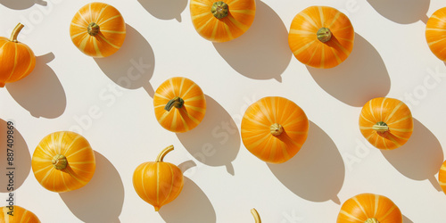 Fototapeta premium A background of butternut squash, each with its shadow, scattered across the canvas in an elegant display, with soft shadows on a white background