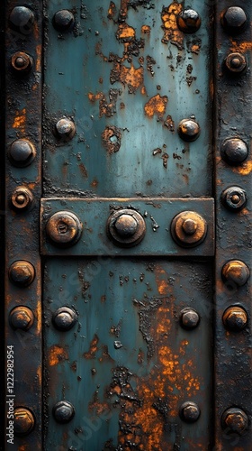 © Pascal, Fototapeta premium A background of riveted metal plates in a weathered industrial setting.