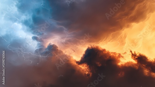 © Jannik, Fototapeta premium A background wallpaper of a stormy, dramatic sky with lightning, featuring dark blue and orange colors
