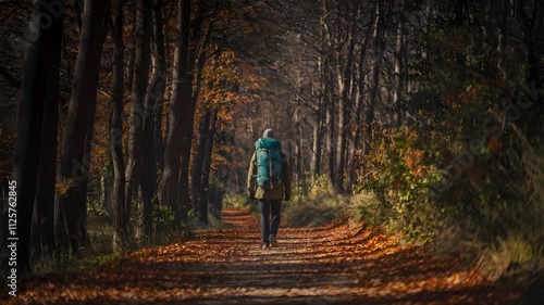 © Shehroz, Obraz premium A backpacker exploring a quiet forest path with falling leaves