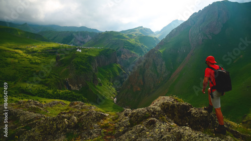 © Павел Чигирь, Obraz premium a backpacker in the mountains on top of a peak looks down at a gorge