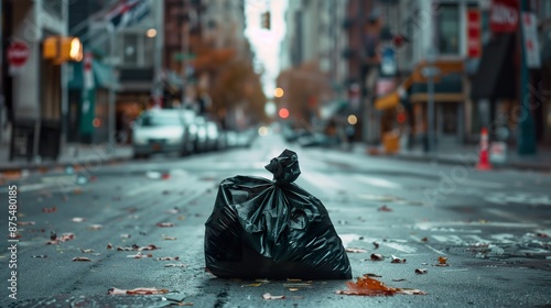 Obraz premium A bag of garbage abandoned in the middle of an empty city street creating a...