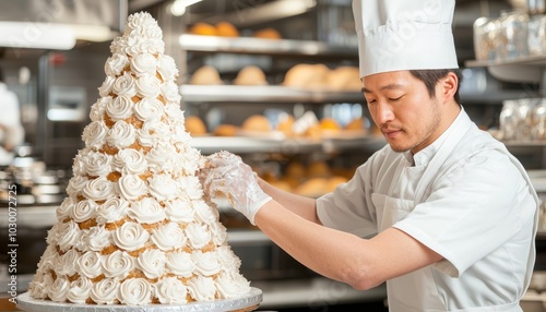 Fototapeta premium A baker decorating a tiered wedding cake, carefully adding intricate designs...