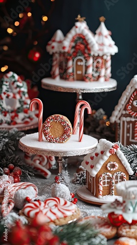 © Barra Fire, Naklejka premium A bakery-inspired Christmas setup with podiums made of frosted cookies surrounded by candy canes and gingerbread houses.