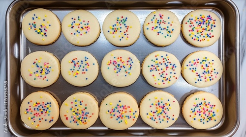 Fototapeta premium A baking sheet full of freshly baked sugar cookies, ready to be decorated with icing and sprinkles