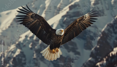 Fototapeta premium A bald eagle is flying over a snowy mountain
