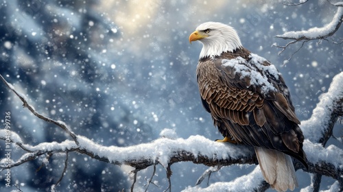 Obraz premium A bald eagle perched on a snowy tree, its feathers contrasting sharply with...