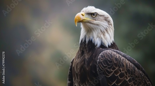 Obraz premium A bald eagle's imposing profile stands out, showcasing its iconic yellow beak...