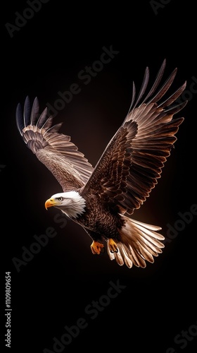 © Ranez, Obraz premium A bald eagle soaring over an American flag, against a dark background