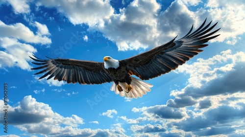 Obraz premium A bald eagle soaring through a cloudy blue sky