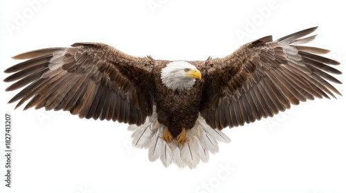 Fototapeta premium A bald eagle soars gracefully with outstretched wings. The bird's keen eyes...