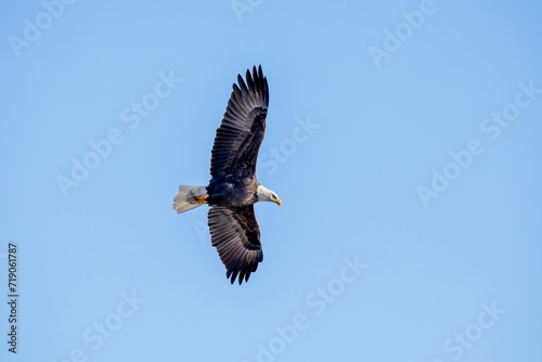 © Katie, Naklejka premium A bald eagle soars in the blue sky with full wingspan on a winter day in January in Iowa. Photo shows the underside of the bird.