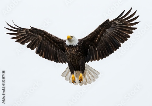 © LUCKY, Fototapeta premium A bald eagle soars through the sky with its wings fully extended against a white background above