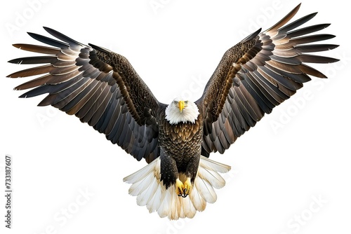 © Alina, Obraz premium A bald eagle soars with spread wings on white background