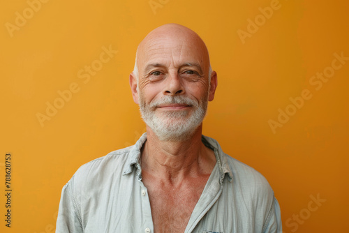 © MagnusCort, Obraz premium A bald man with a beard is smiling in front of an orange background