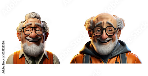 © Shawon, Fototapeta premium A bald old man 3d character with white beard and eyeglasses is smiling and expressing happiness on transparent background.