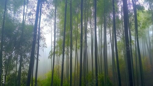 © MuhammadHassaan, Fototapeta premium A bamboo forest with tall, slender green stalks rising vertically, captured in early morning mist