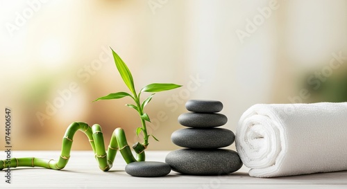 © Sim, Obraz premium A bamboo plant with green leaves and a white towel on a wooden table.