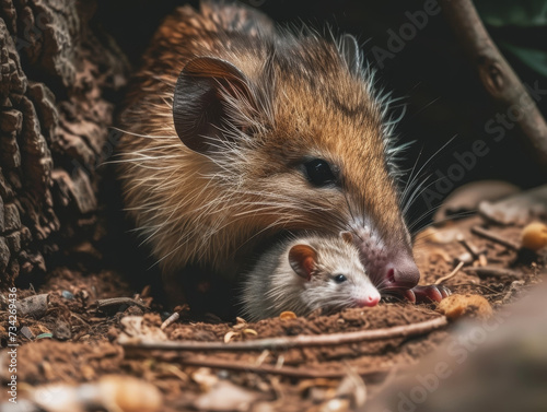 Naklejka premium A bandicoot with her young, resting on the forest floor together.