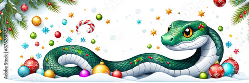 © lastfurianec, Fototapeta premium A banner with a cute cartoon snake with snowflakes, branches of a Christmas tree decorated with Christmas toys.