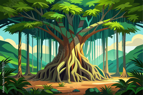 Naklejka premium A banyan tree with aerial roots, casting a cool shade in a lush tropical...