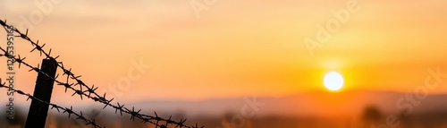 Obraz premium A Barbed Fence Silhouetted Against a Vibrant Sunset Sky Evoking Feelings of...