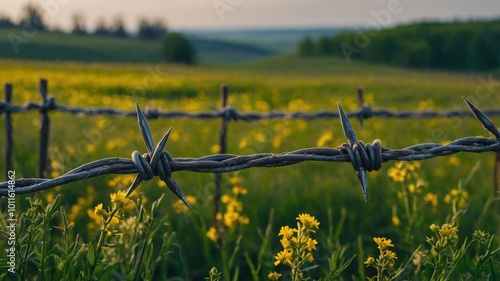 Fototapeta premium A barbed wire fence lines a meadow filled with yellow wildflowers under a...