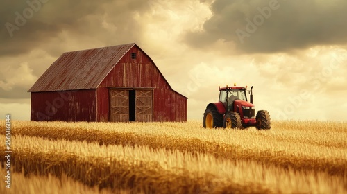 © sarun, Fototapeta premium A barn and tractor icon together on a golden field, representing traditional farming.