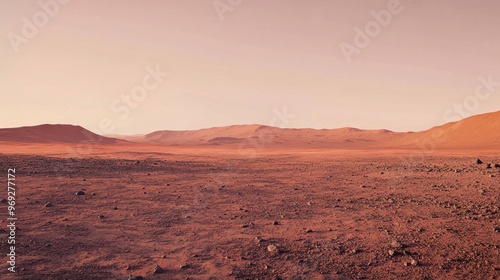 © BerkahStock, Fototapeta premium A barren Martian landscape showcasing red soil and distant hills under a pastel sky.
