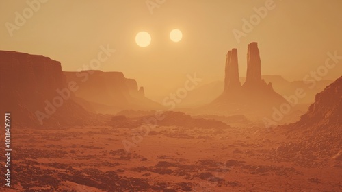 © jamrut, Naklejka premium A barren planet with a rust-colored desert landscape sun in the sky casting long shadows, and rugged, jagged mountain ranges in the distance