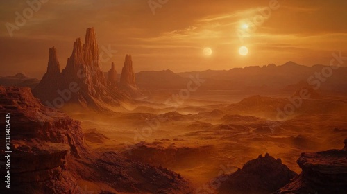 © jamrut, Naklejka premium A barren planet with a rust-colored desert landscape sun in the sky casting long shadows, and rugged, jagged mountain ranges in the distance