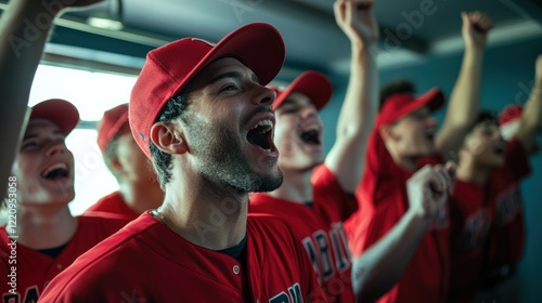 Fototapeta premium A baseball team singing the team anthem in the locker room before heading onto the field.