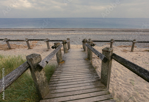 © leighton collins, Obraz premium A basic wooden boardwalk allowing easy access to a beach.