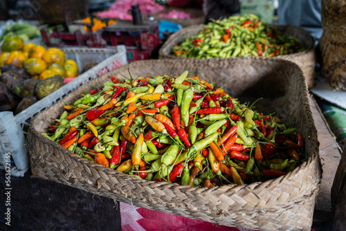 Fototapeta premium A basket full of fresh Indonesian chilli peppers, also called rawit or bird's...
