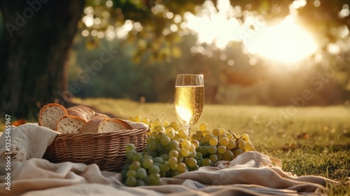 © Mrammon, Fototapeta premium A basket of bread and grapes sits on a blanket in a grassy field