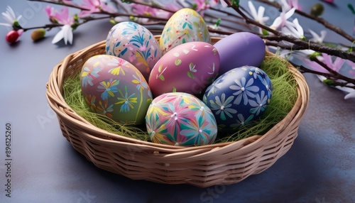 Fototapeta premium A basket of colorful hand painted Easter eggs