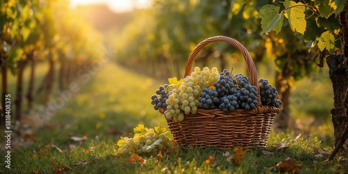 © vxnaghiyev, Naklejka premium A basket of white and black grapes used in wine making, emphasizing viticulture practices, Earth Day