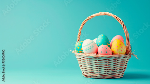 Naklejka premium A basket sits brimming with vibrant Easter eggs in various colors against a...