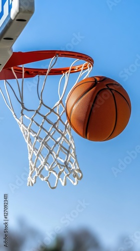 Fototapeta premium A basketball gracefully swishes through the net as players enjoy an exhilarating outdoor game beneath a clear blue sky