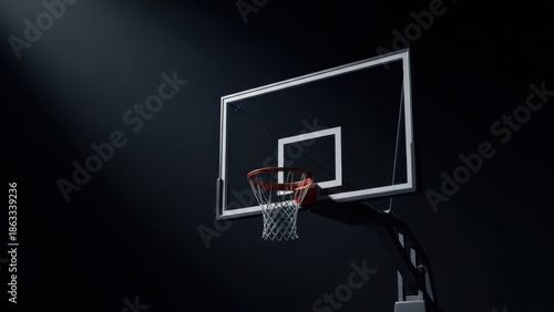 © Donnangelo, Fototapeta premium A basketball hoop stands alone in a dark room with a spotlight shining down on it.