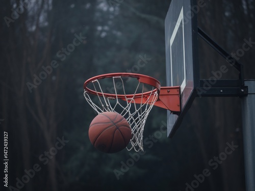 Fototapeta premium A basketball is about to swish through the hoop, illuminating the dark and moody surroundings.