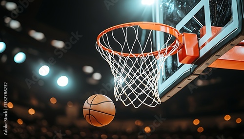 Fototapeta premium A basketball soaring towards the net on a brightly lit court