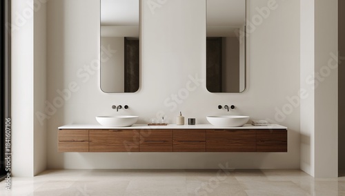 © -Quantum Pixels-, Obraz premium A bathroom featuring dual wooden sinks and a glass mirror, highlighting material durability and maintenance, Earth Day