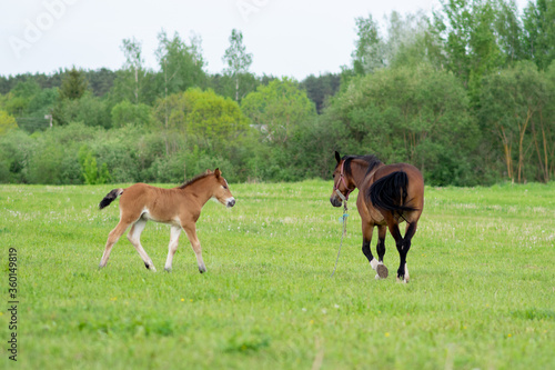 Fototapeta premium A bay horse with a foal in a field on a grazing.