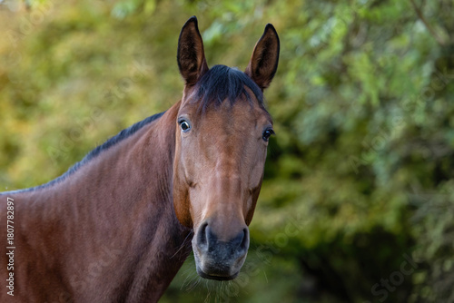 Obraz premium A bay Standardbred gelding looks calmly toward the camera while standing outdoors, surrounded by soft natural light and greenery.