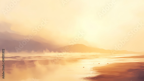 Fototapeta premium A beach at dawn with a gentle mist rising from the wet sand, beach, defocused, dawn. Dawn. Illustration