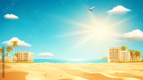 © Nathamanee, Obraz premium A beach scene with a plane flying in the sky