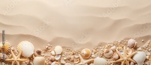 Naklejka premium A beach scene with sand and shells. The sand is a light tan color and the shells are scattered throughout the scene. Scene is calm and peaceful, as if one were walking along the beach