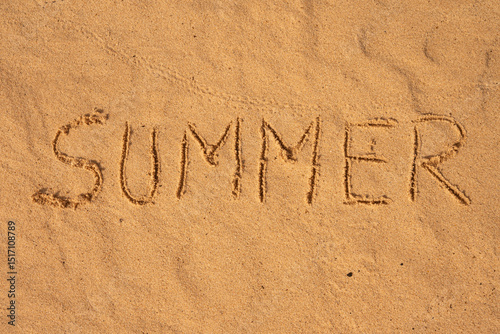 © Jonathan, Fototapeta premium A beach scene with the word "summer" written in the sand. Concept of relaxation and leisure, as summer is often associated with vacations and spending time at the beach
