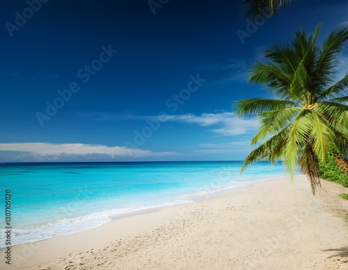 © Aaron, Obraz premium a beach with palm trees and a blue ocean